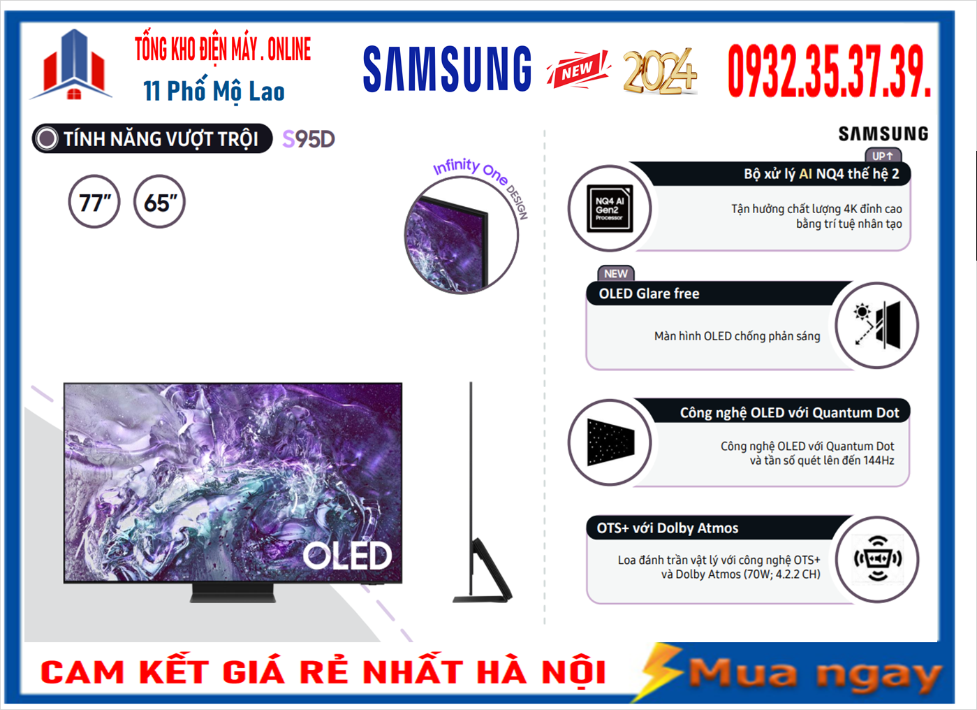 Smart Tivi OLED Samsung 4K 77 inch QA77S95D hiện hình ảnh 4K sắc nét, sắc đen sâu thẳm. Bộ xử lý AI NQ4 thế hệ 2 tiên tiến và công nghệ Real Depth Enhancer giúp tạo ra hình ảnh có chiều sâu ấn tượng. Ngoài ra, tivi này còn tích hợp công nghệ âm thanh 3D Dolby Atmos mạnh mẽ và ứng dụng Google Duo cho cuộc gọi video mượt mà.