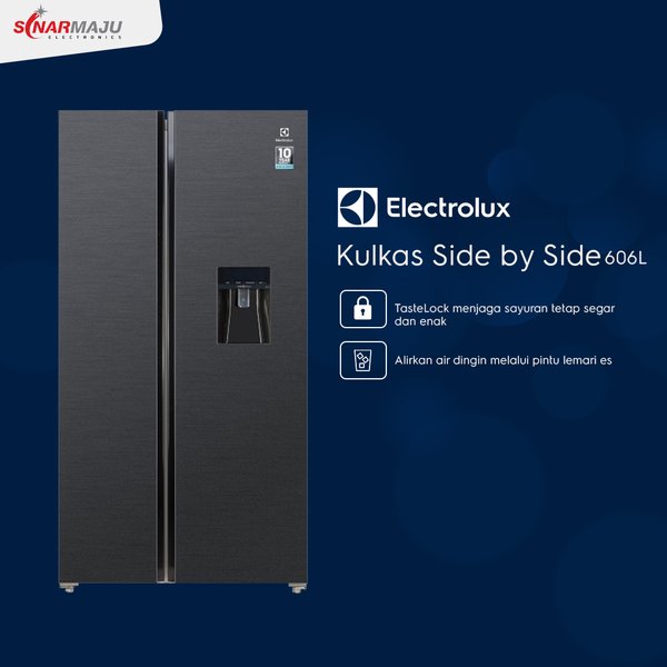 Tủ lạnh Electrolux Inverter 571 lít ESE6141A-BVN với thiết kế Side by Side hiện đại cùng gam màu đen huyền bí giúp không gian bếp của gia đình bạn thêm phần sang trọng, nổi bật. Bên cạnh đó, chất liệu cửa tủ được làm từ thép không gỉ có khả năng chống ăn mòn, chịu nhiệt độ cao khi sử dụng.